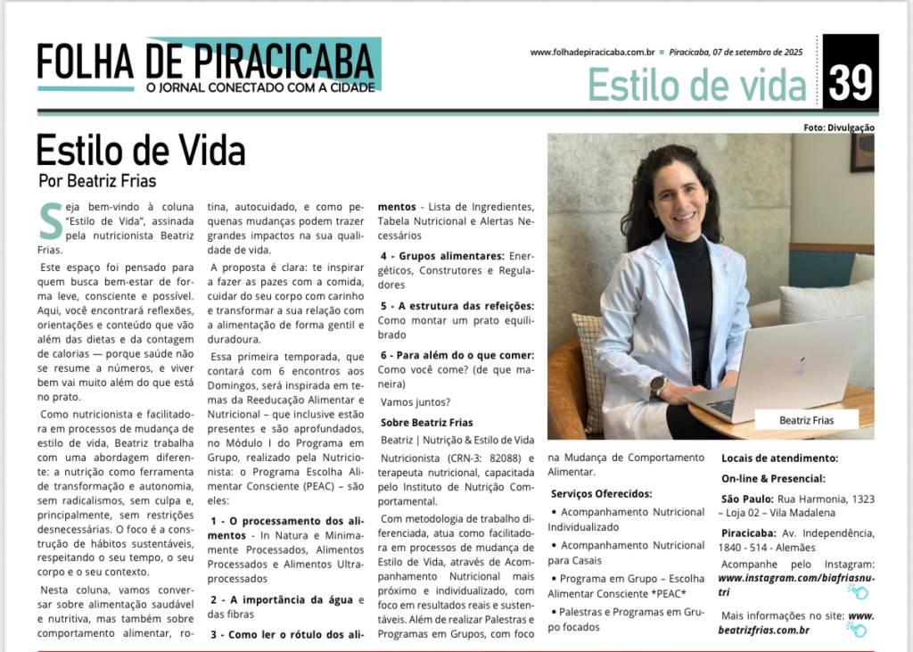 Seja bem-vindo à coluna “Estilo de Vida”, assinada pela nutricionista Beatriz Frias.