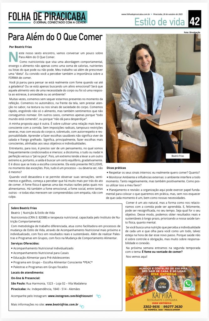 Como nutricionista que visa uma abordagem comportamental, enxergo o alimento não apenas como uma soma de calorias, nutrientes ou listas do que pode ou não pode. Meu trabalho vai além de prescrever uma “dieta”. Eu convido você a perceber também a importância sobre a FORMA de comer.