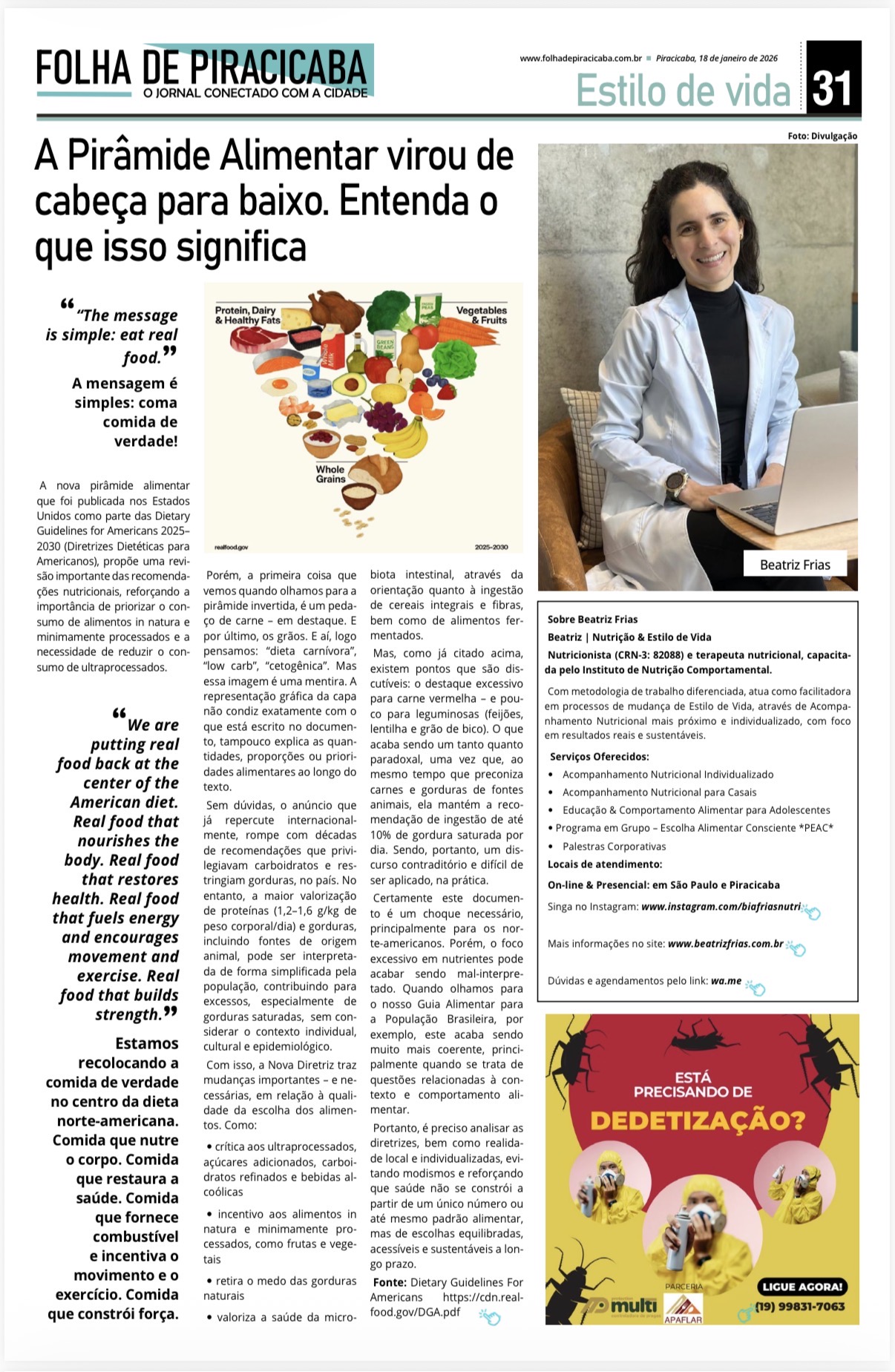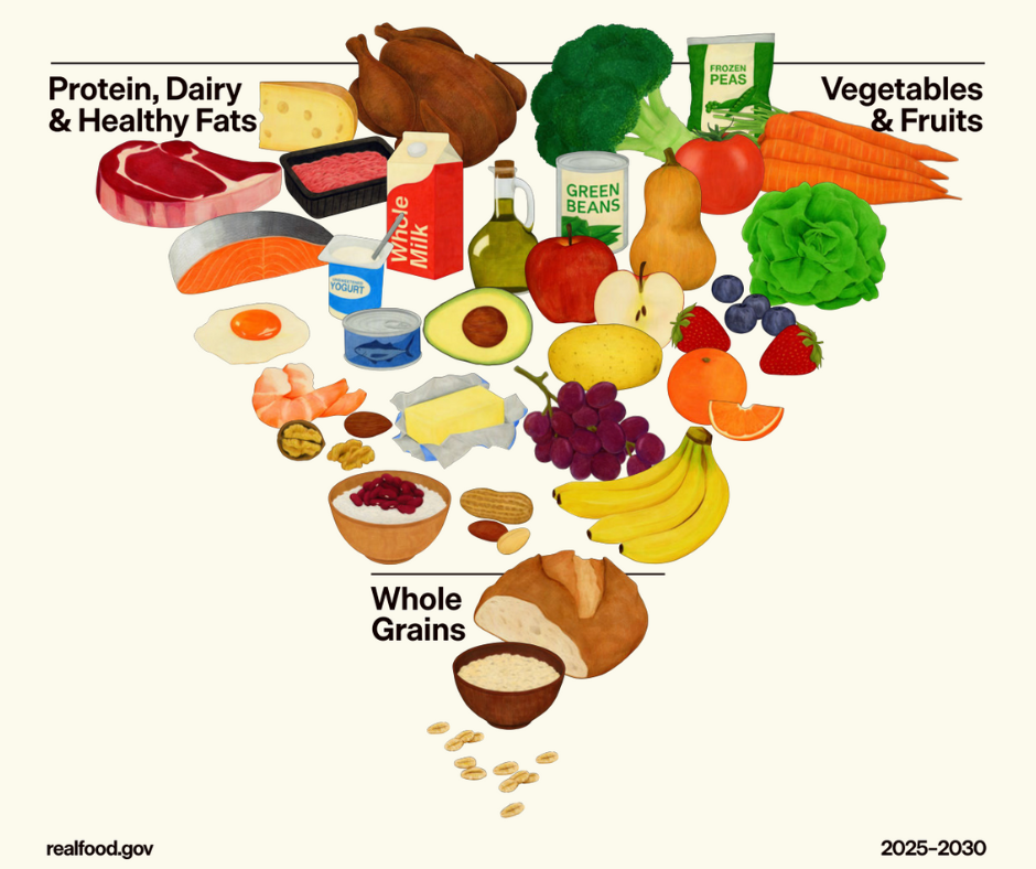 A nova pirâmide alimentar que foi publicada nos Estados Unidos como parte das Dietary Guidelines for Americans 2025–2030 (Diretrizes Dietéticas para Americanos), propõe uma revisão importante das recomendações nutricionais, reforçando a importância de priorizar o consumo de alimentos in natura e minimamente processados e a necessidade de reduzir o consumo de ultraprocessados.